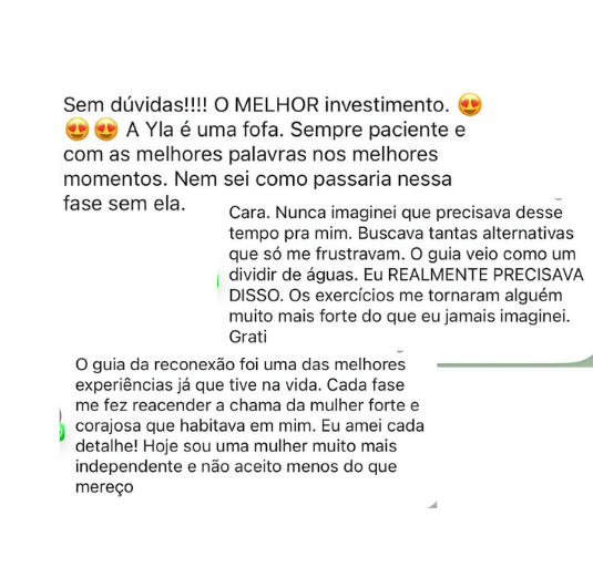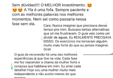 "O Guia da Reconexão foi a chave da libertação pra mim. A Yla sempre muito acolhedora e sensível, me deu os melhores conselhos que eu poderia receber. Hoje meu coração está mais leve e feliz."